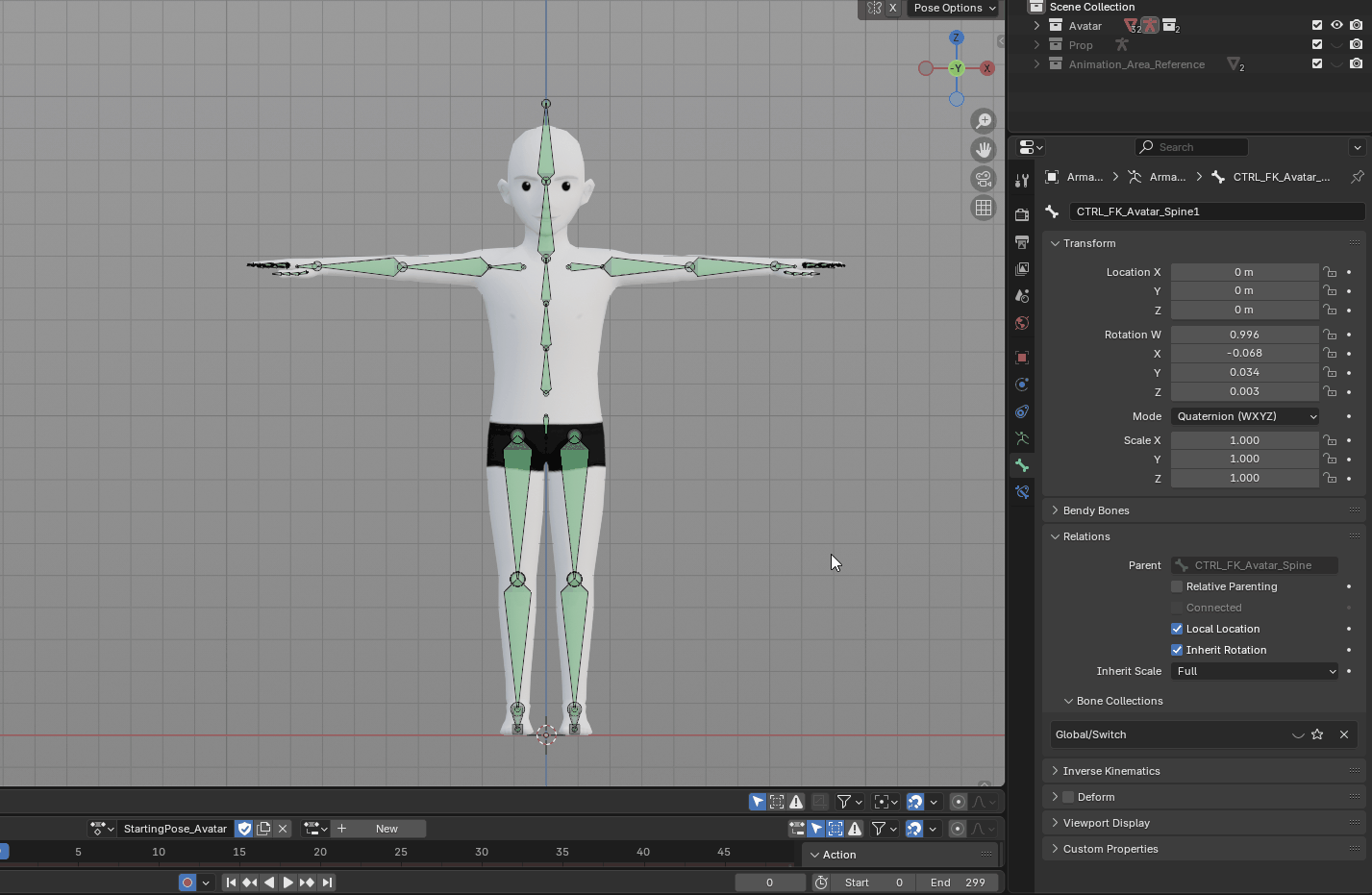 A rig is a virtual skeleton that allows a model to move. It consists of a hierarchy of individual bones, much like a real life skeleton, and it works under a parent/child relationship. This document will cover some basic rigging concepts, such as bone position, bone orientation, deforming and non-deforming bones, the difference between IK and FK and their purposes. The structure of an avatar’s rig, custom attributes, and setup for animating can be found in rig features .