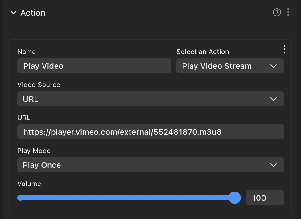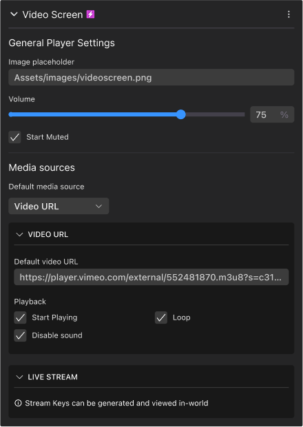 • Automatic: The video starts playing as soon as the scene loads. For this, set the default media source dropdown to Video URL and paste a URL directly into the Default Video URL field.