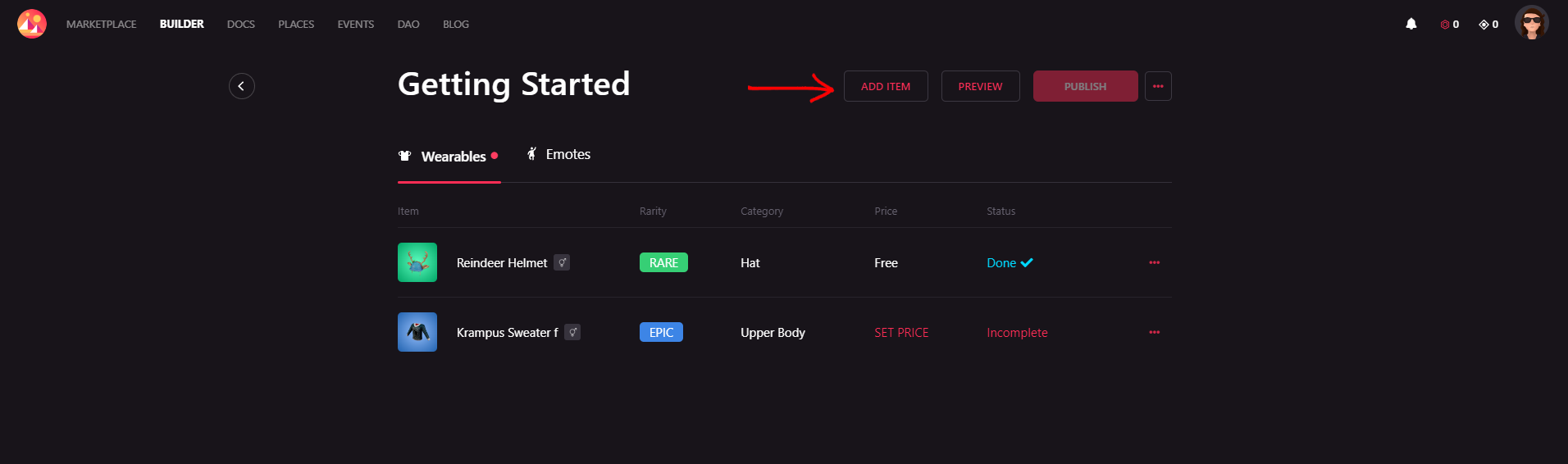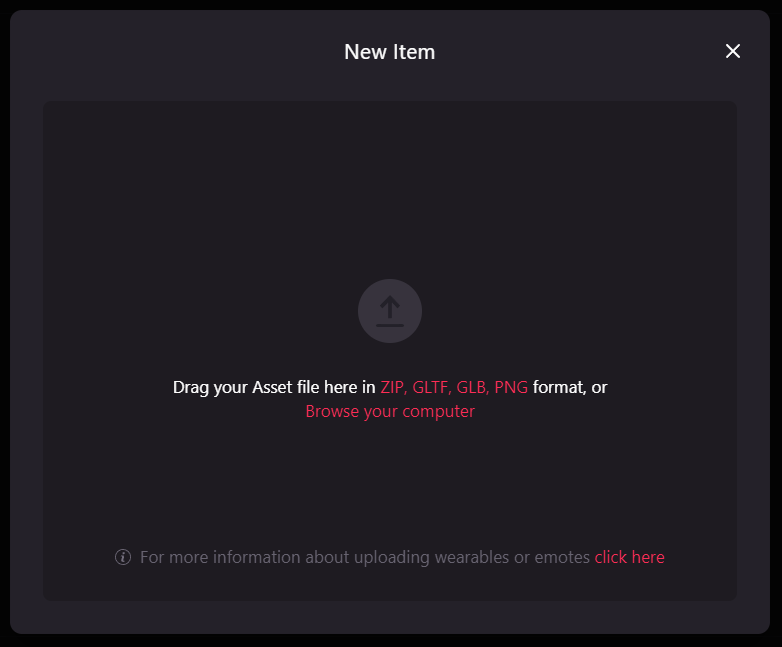 Now, you’re ready to add items to it. For that, just click on the button Add Item and just drag and drop the file with your wearable/emote or browse your computer.