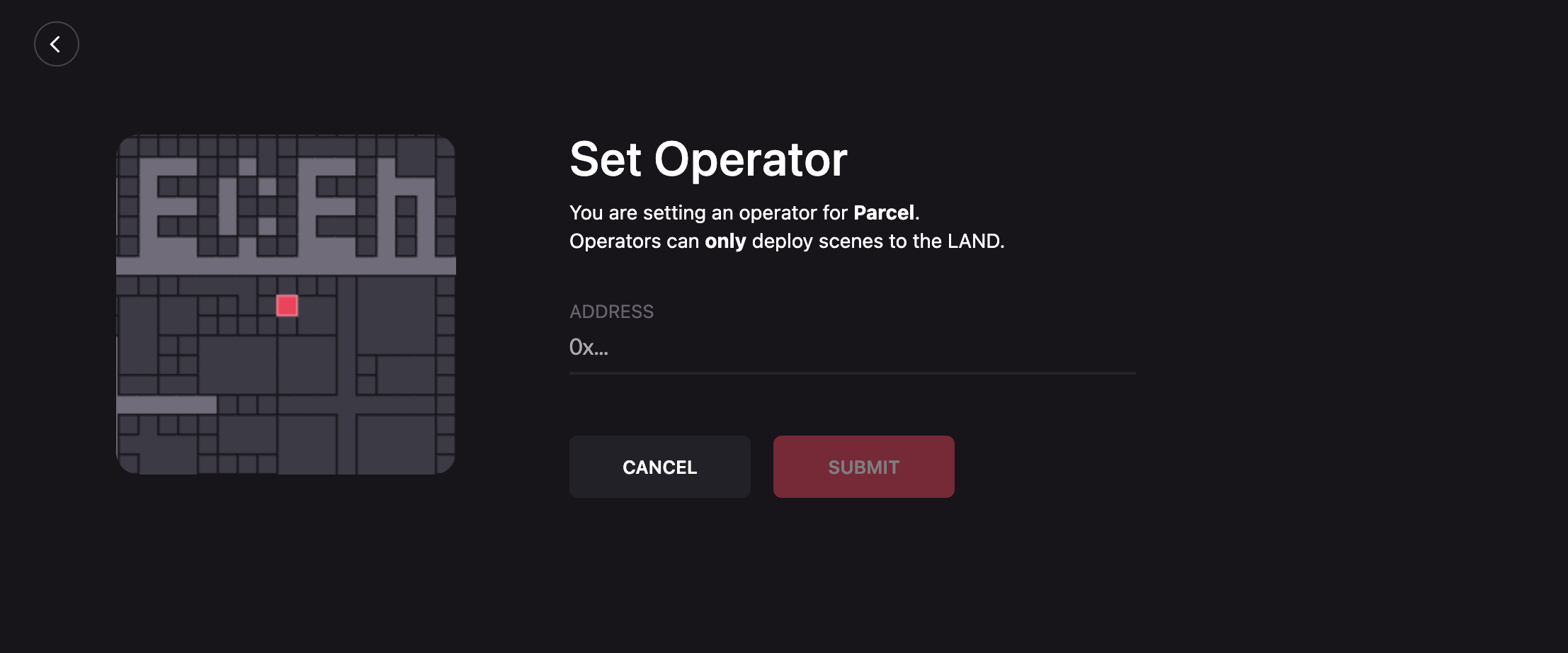 By clicking on one of the parcels or Estates listed under Land, you can edit its name, description, set an operator, or transfer it directly to another wallet address.
